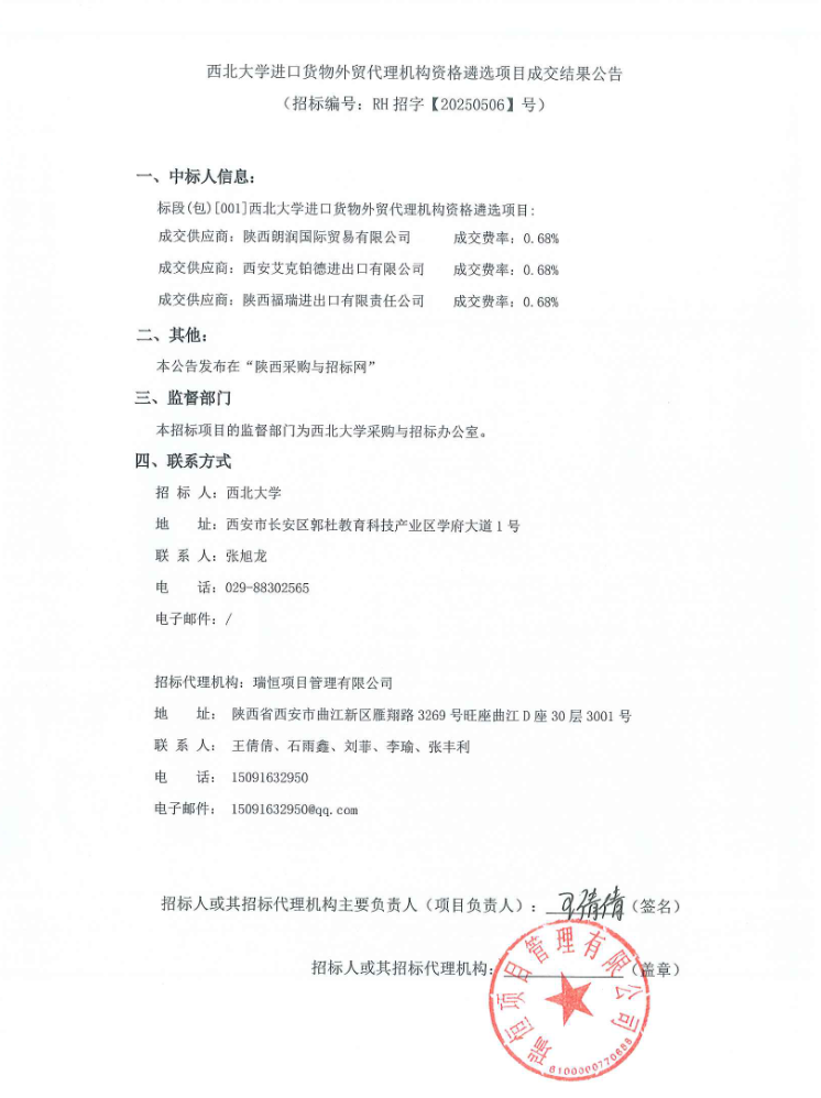 西北大学进口货物外贸代理机构资格遴选项目成交结果公告