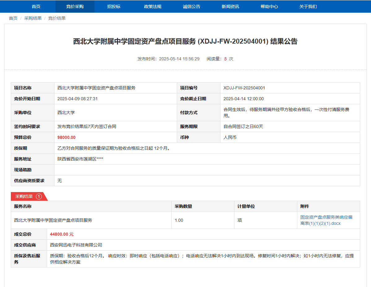 西北大学附属中学固定资产盘点项目服务(XDJJ-FW-202504001)竞价结果公告