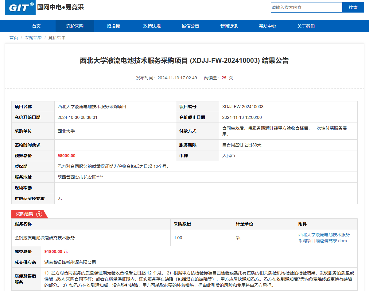 西北大学液流电池技术服务采购项目(XDJJ-FW-202410003)竞价结果公告