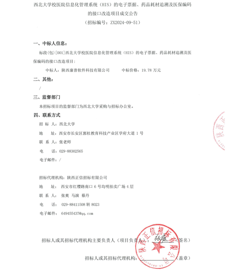 西北大学校医院信息化管理系统(HIS)的电子票据、药品耗材追溯及医保编码的接口改造项目成交公告