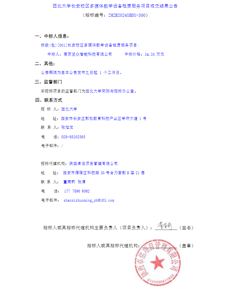 西北大学长安校区多媒体教学设备租赁服务项目成交结果公告