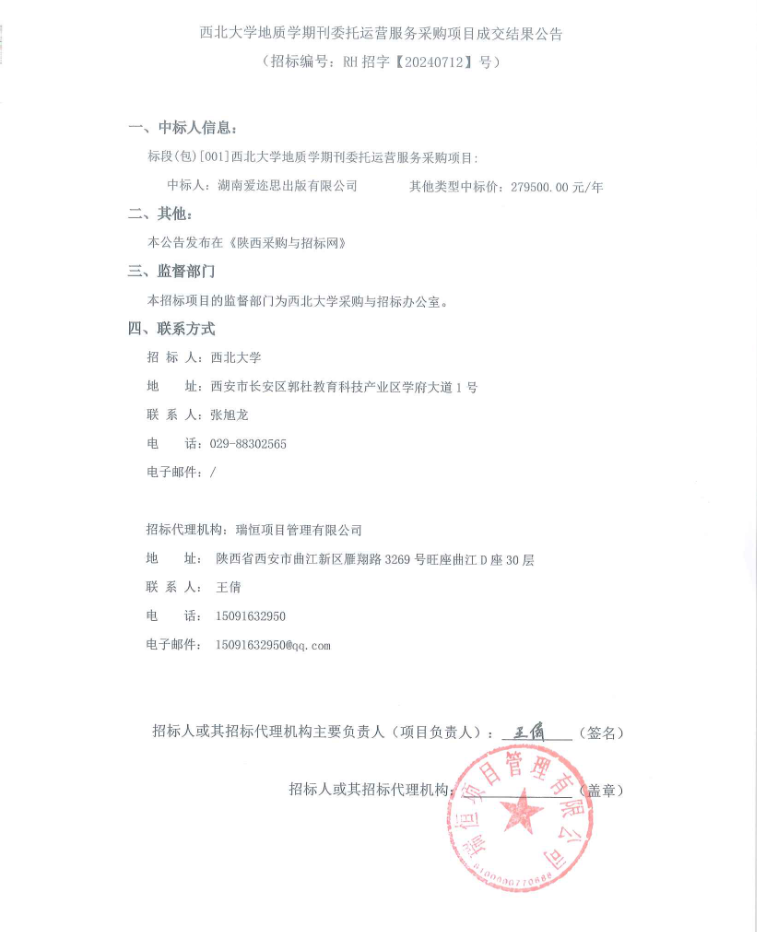 西北大学地质学期刊委托运营服务采购项目成交结果公告
