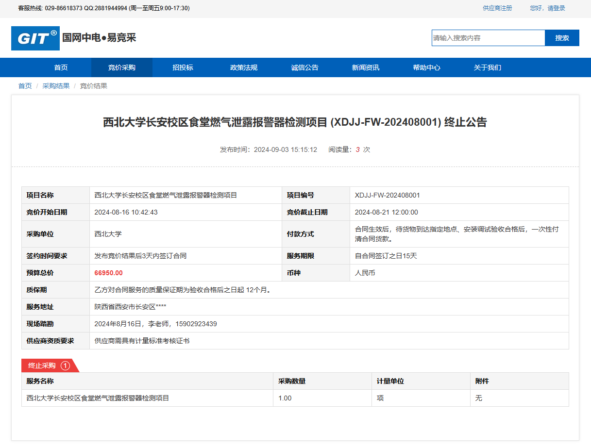 西北大学长安校区食堂燃气泄露报警器检测项目 (XDJJ-FW-202408001) 竞价终止公告