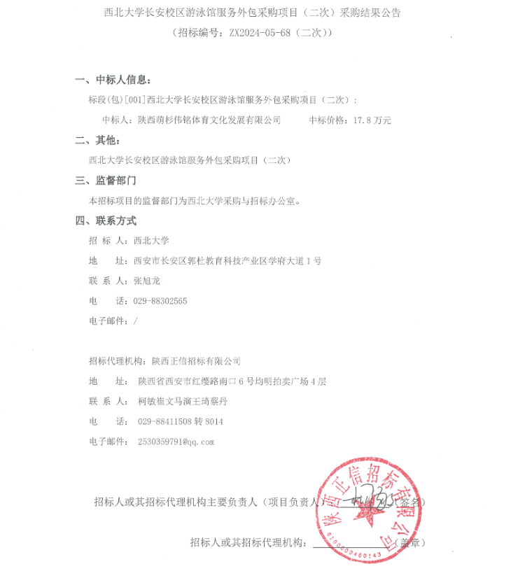 西北大学长安校区游泳馆服务外包采购项目(二次)采购结果公告