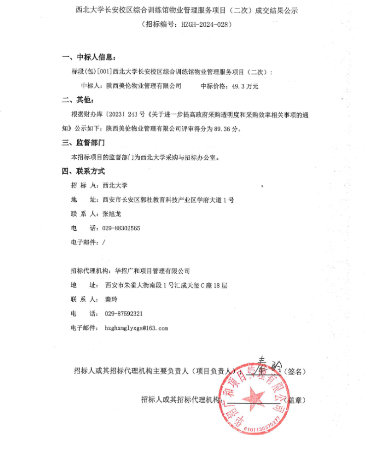 西北大学长安校区综合训练馆物业管理服务项目(二次)成交结果公示