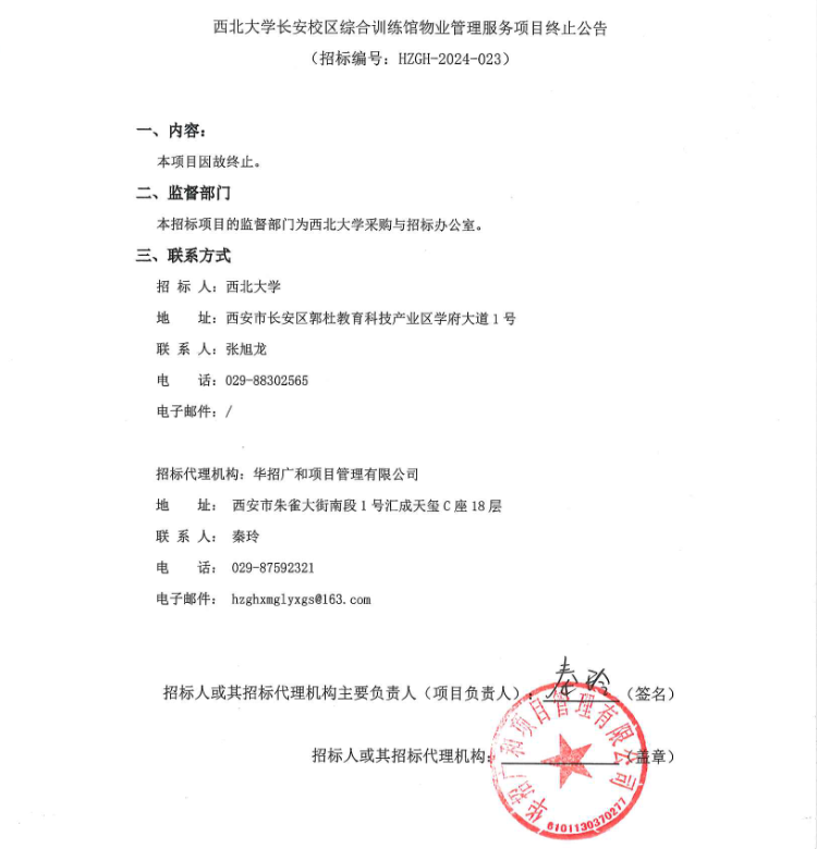 西北大学长安校区综合训练馆物业管理服务项目终止公告