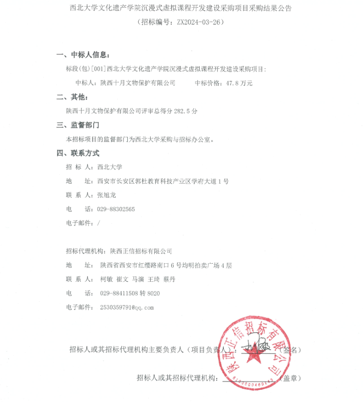 西北大学文化遗产学院沉漫式虚拟课程开发建设采购项目采购结果公告