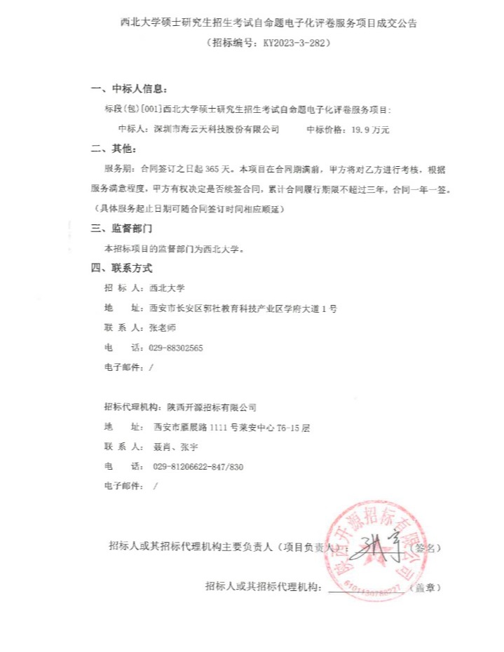 西北大学硕士研究生招生考试自命题电子化评卷服务项目成交公告