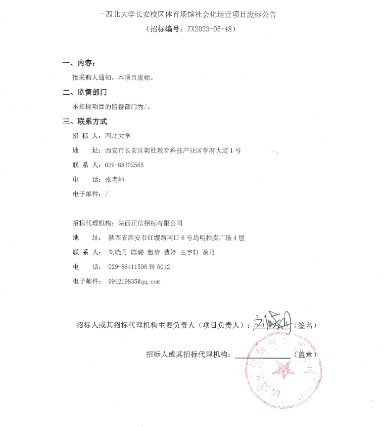 西北大学长安校区体育场馆社会化运营项目废标公告