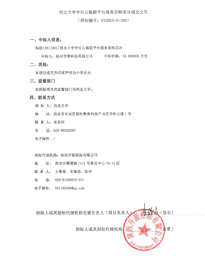 西北大学学位云数据平台服务采购项目成交公告