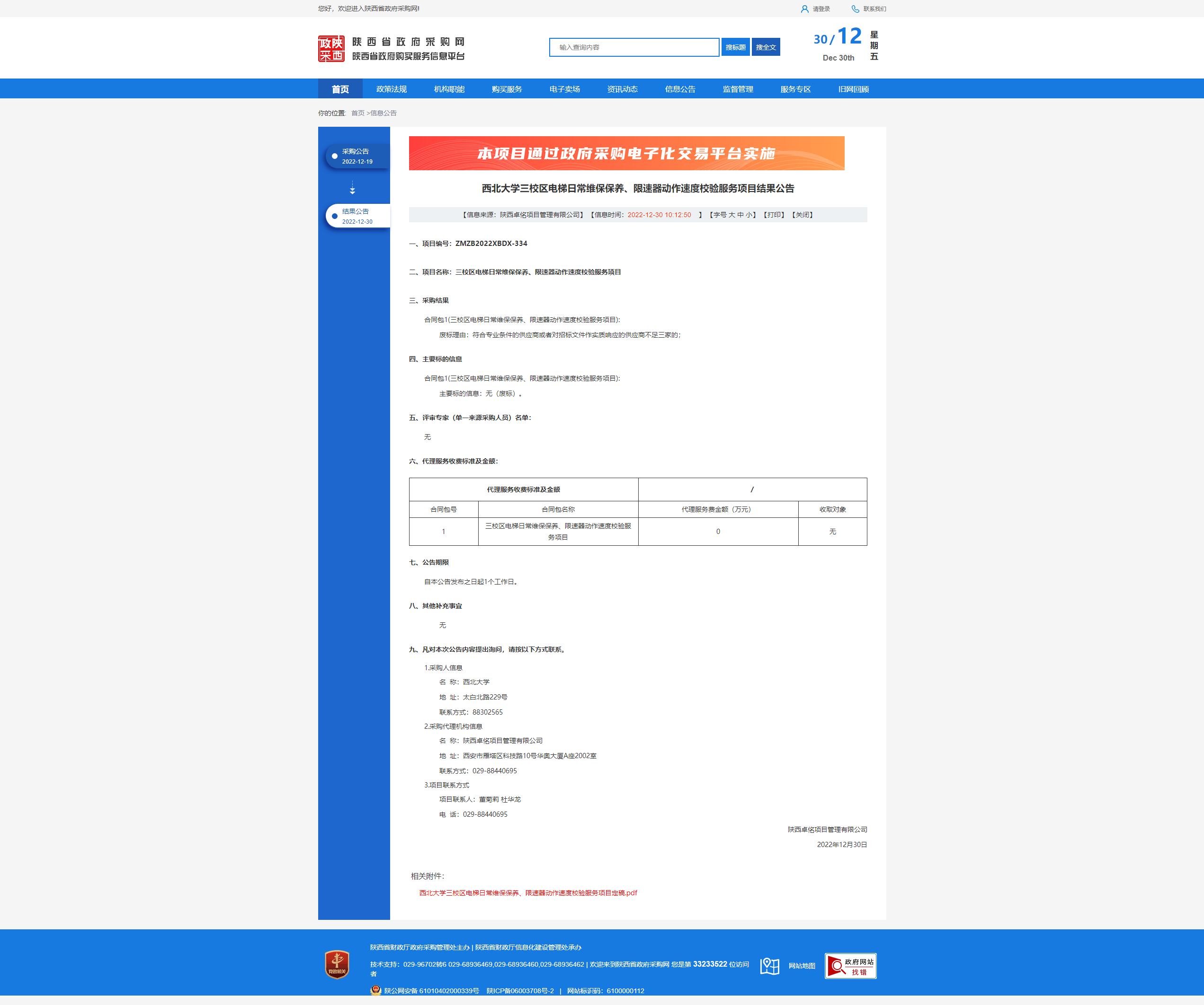 西北大学三校区电梯日常维保保养、限速器动作速度校验服务项目结果公告
