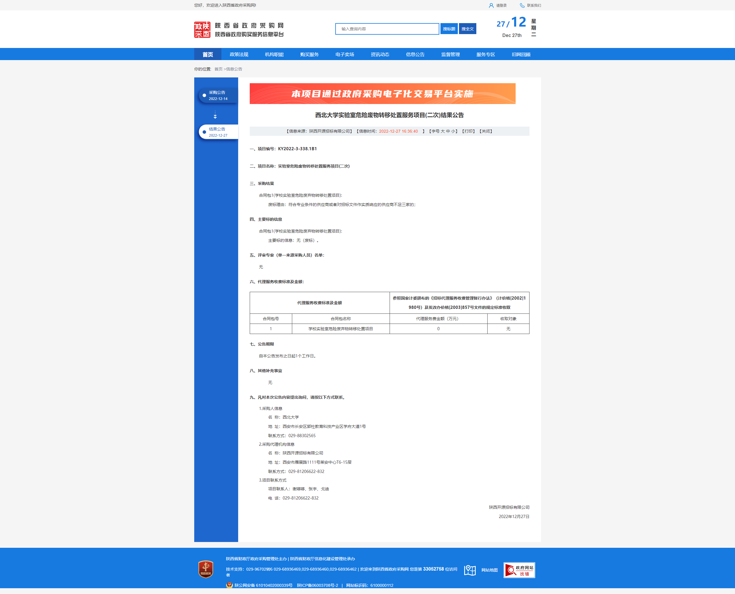 西北大学实验室危险废物转移处置服务项目(二次)结果公告