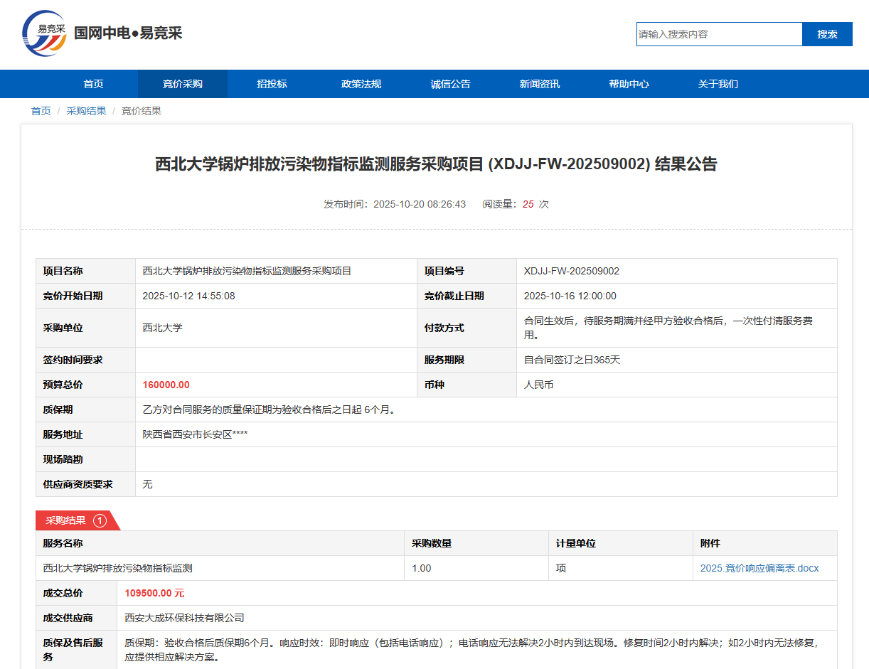 西北大学锅炉排放污染物指标监测服务采购项目(XDJJ-FW-202509002)竞价结果公告