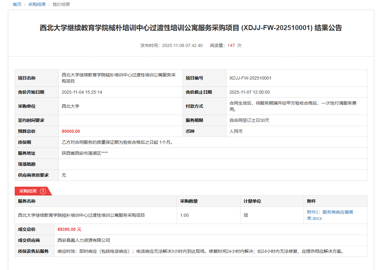 西北大学继续教育学院棫朴培训中心过渡性培训公寓服务采购项目(XDJJ-FW-202510001)竞价结果公告