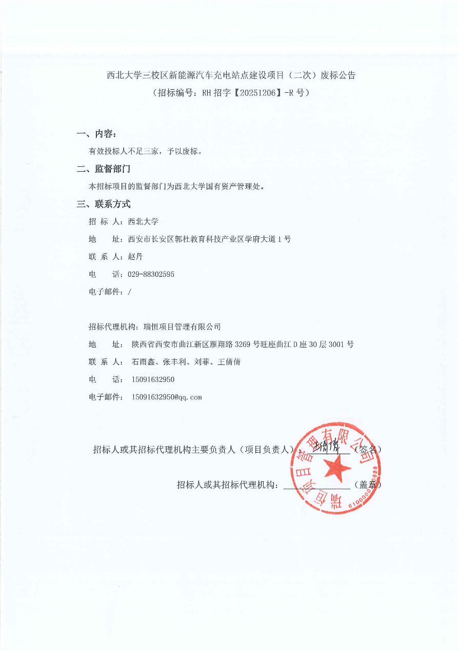西北大学三校区新能源汽车充电站点建设项目(二次)废标公告