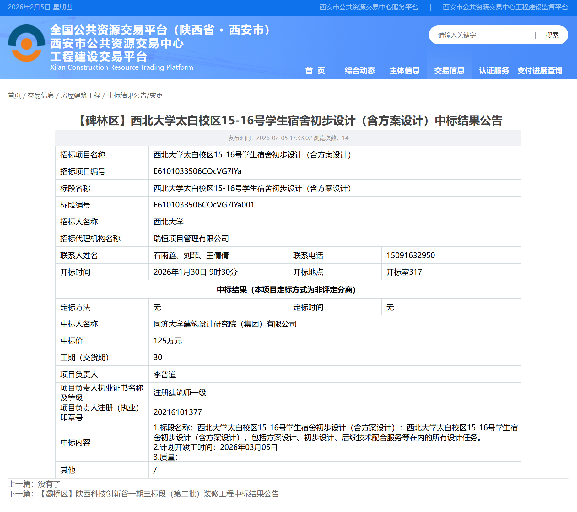 西北大学太白校区15-16号学生宿舍初步设计(含方案设计)中标结果公告