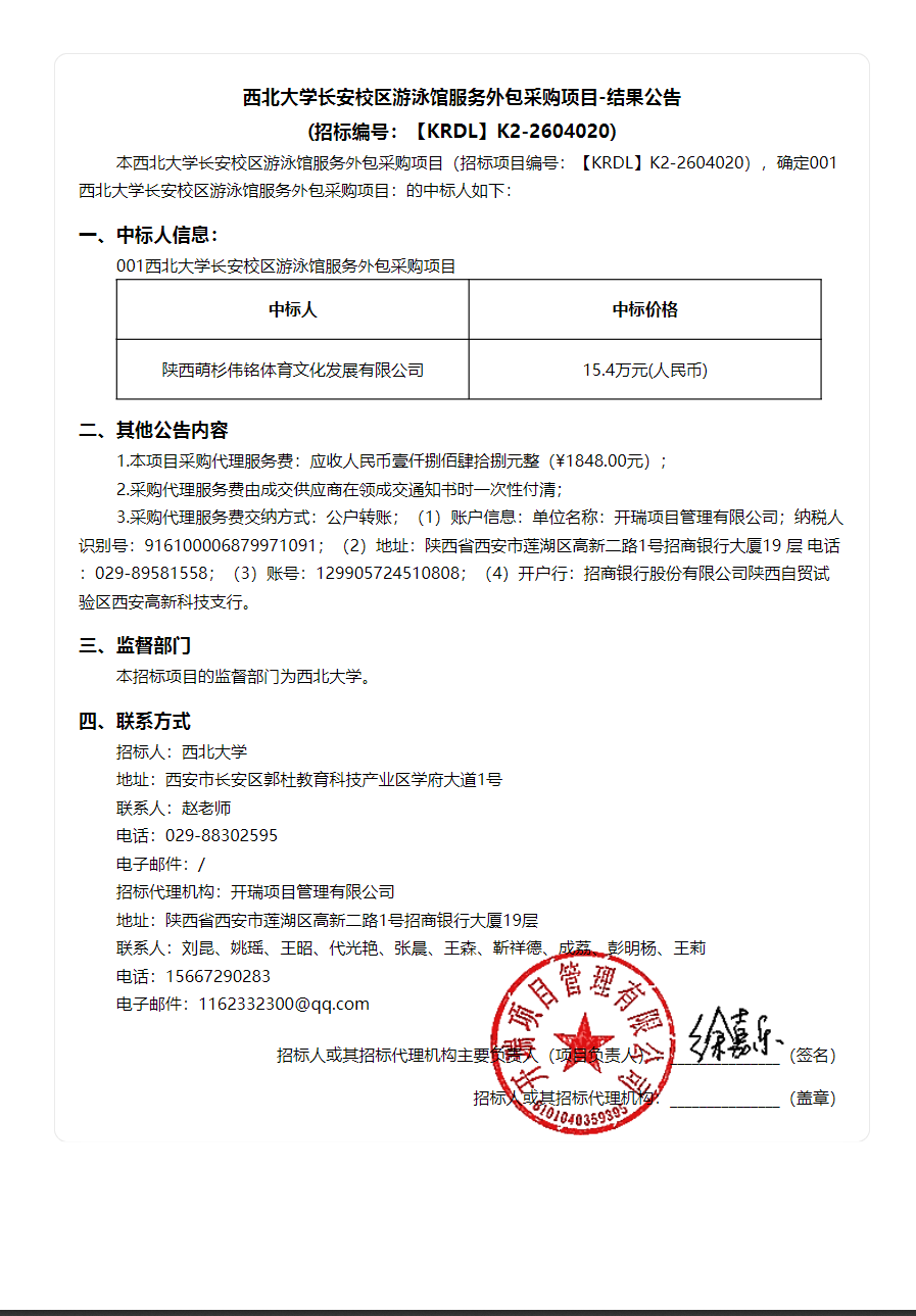 西北大学长安校区游泳馆服务外包采购项目-结果公告