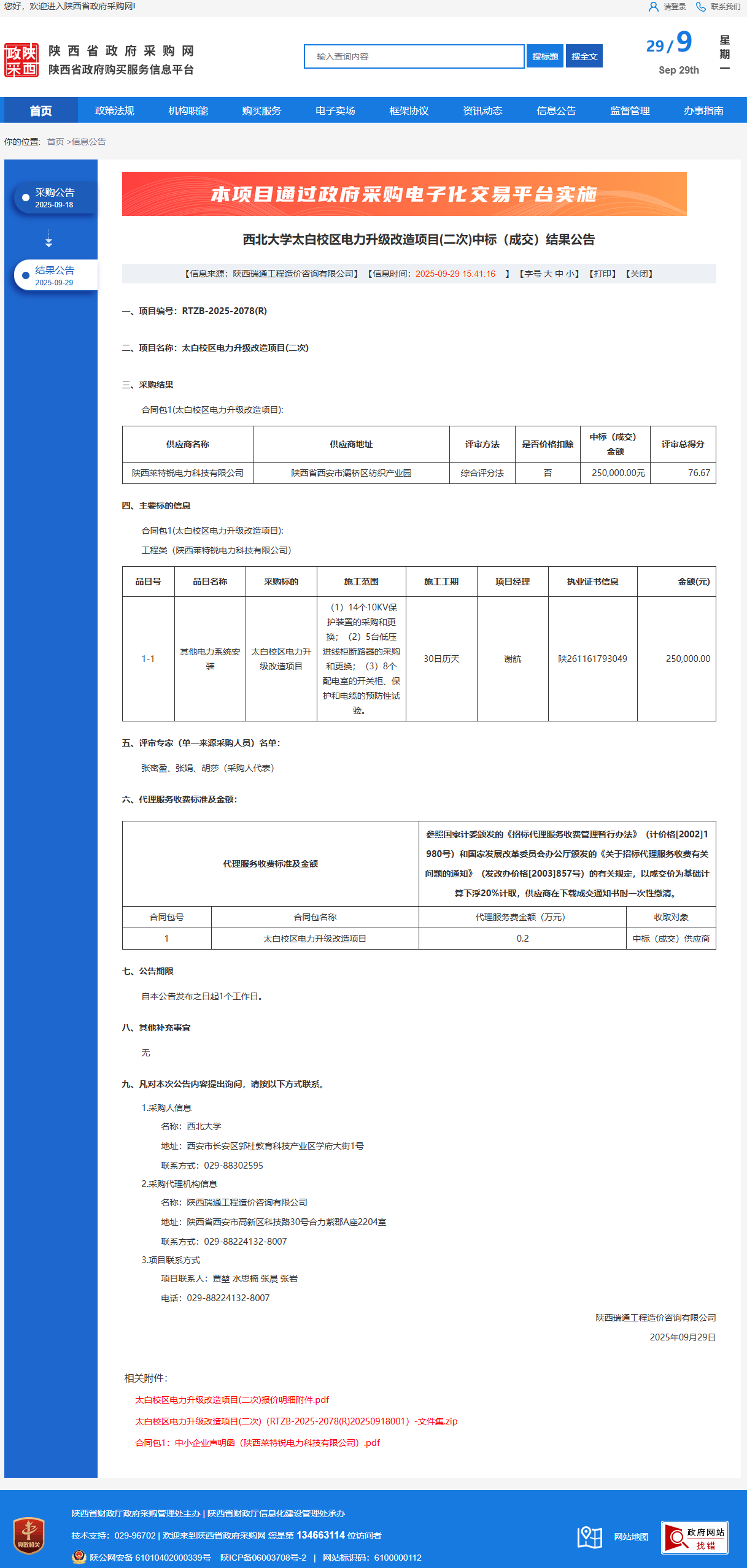 西北大学太白校区电力升级改造项目(二次)中标(成交)结果公告