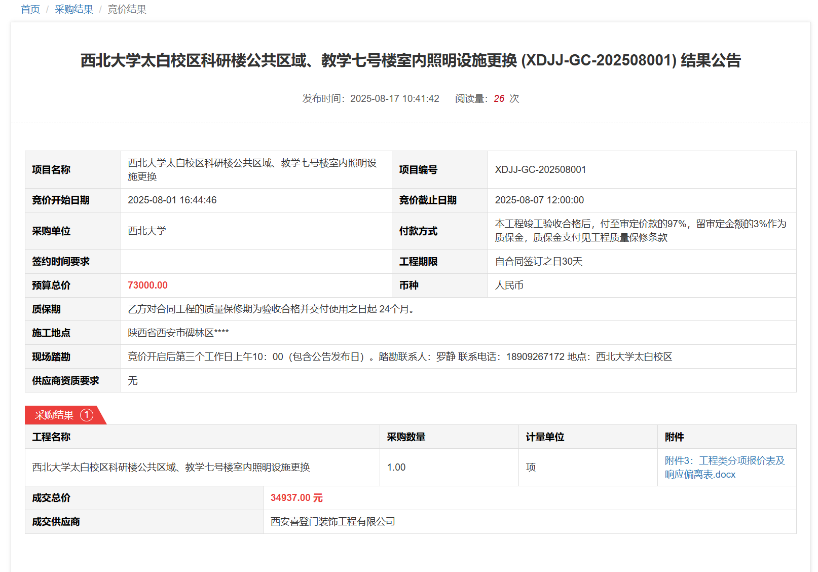 西北大学太白校区科研楼公共区域、教学七号楼室内照明设施更换(XDJJ-GC-202508001)竞价结果公告