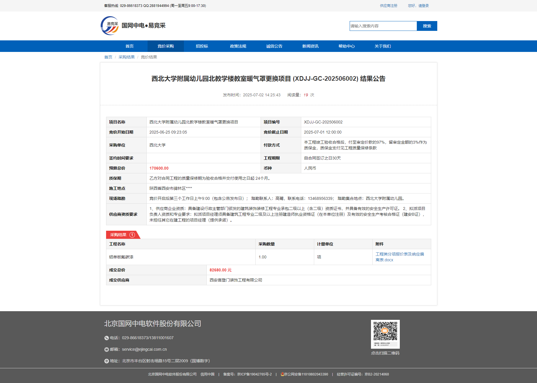 西北大学附属幼儿园北教学楼教室暖气罩更换项目 (XDJJ-GC-202506002) 结果公告