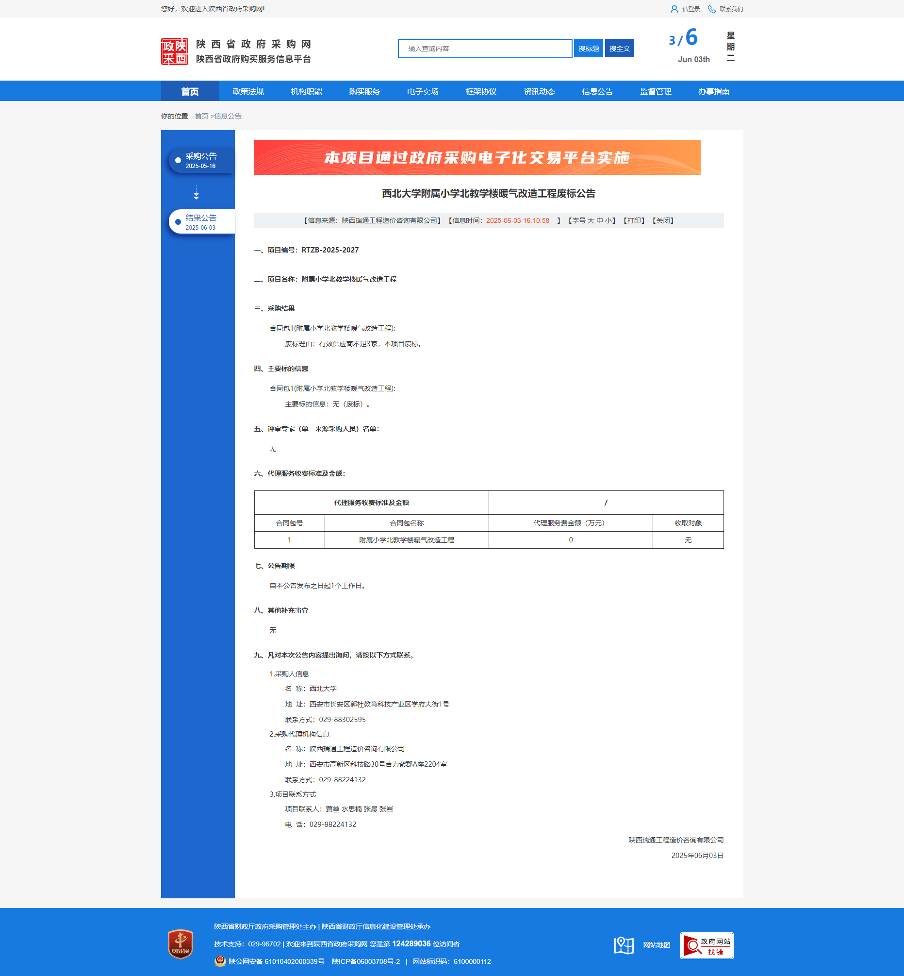 西北大学附属小学北教学楼暖气改造工程废标公告