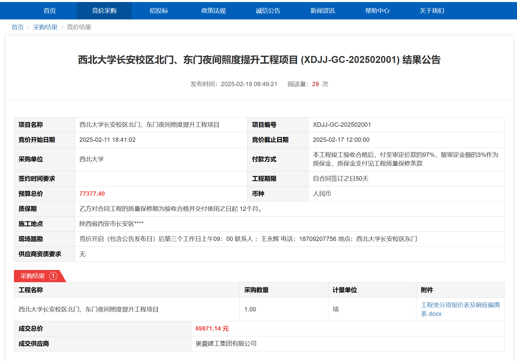 西北大学长安校区北门、东门夜间照度提升工程项目(XDJJ-GC-202502001)竞价结果公告
