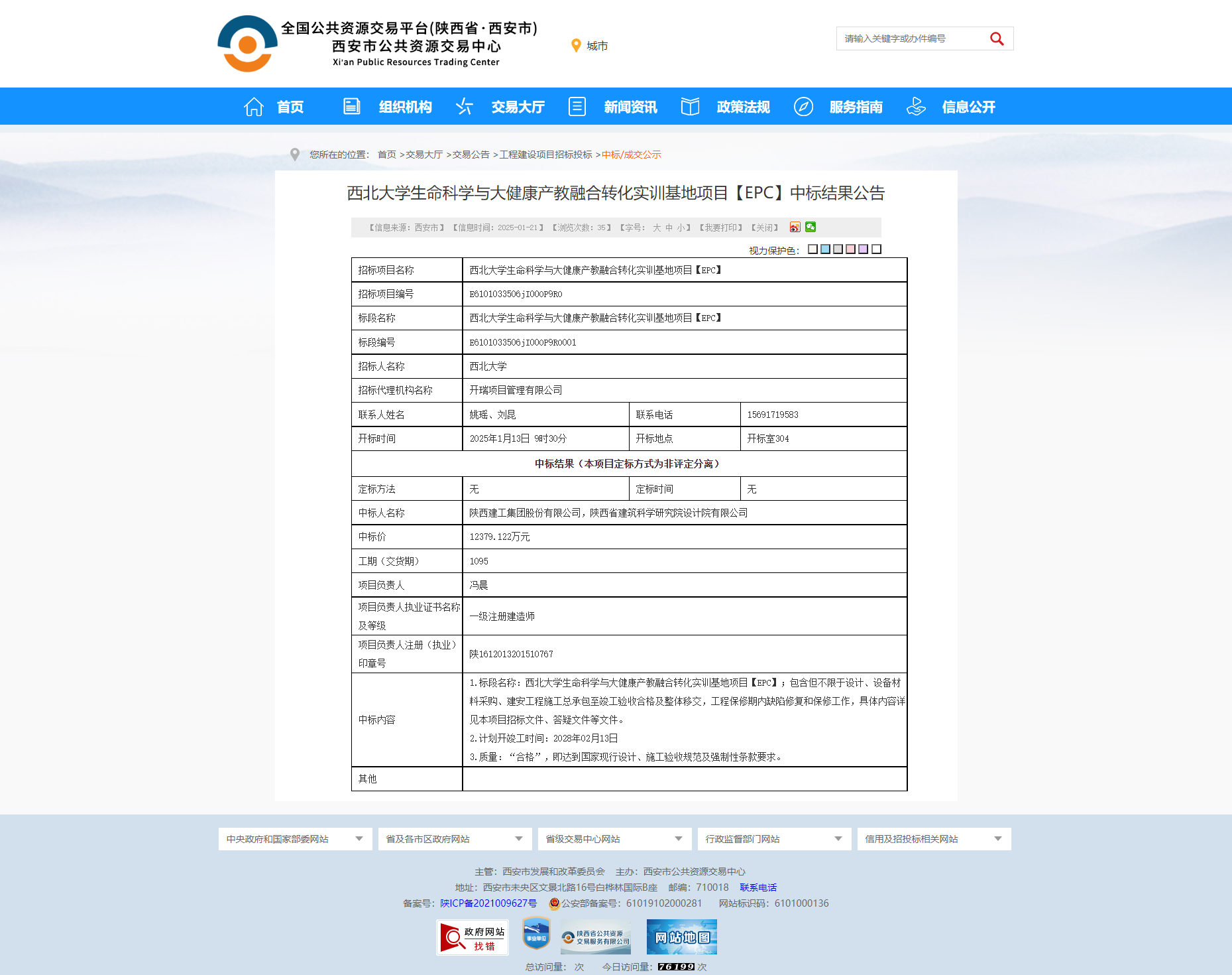 西北大学生命科学与大健康产教融合转化实训基地项目【EPC】中标结果公告