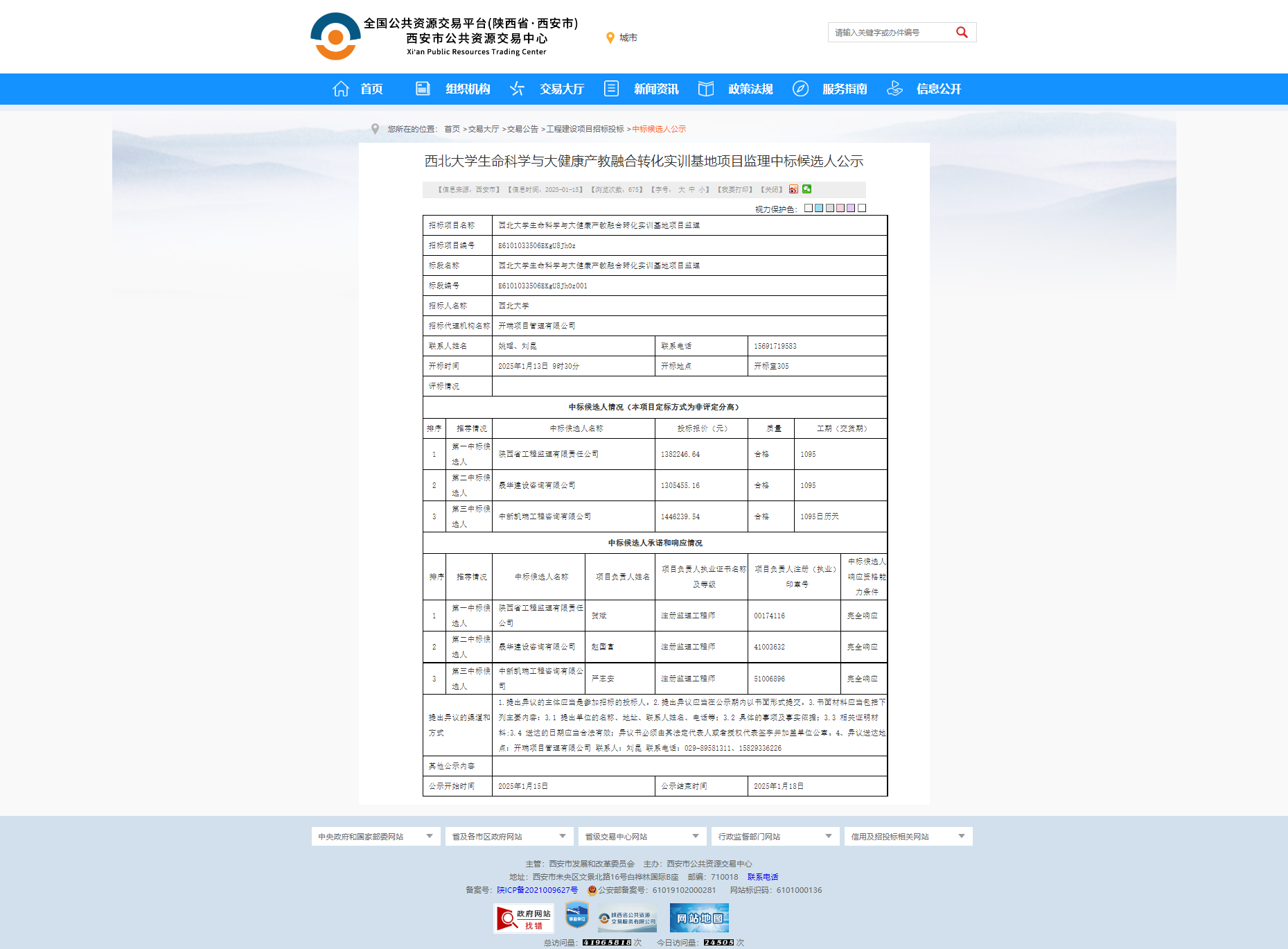 西北大学生命科学与大健康产教融合转化实训基地项目监理中标候选人公示