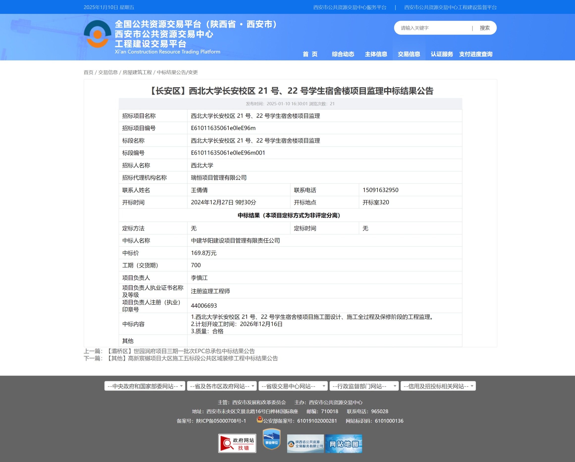 西北大学长安校区 21 号、22 号学生宿舍楼项目监理中标结果公告