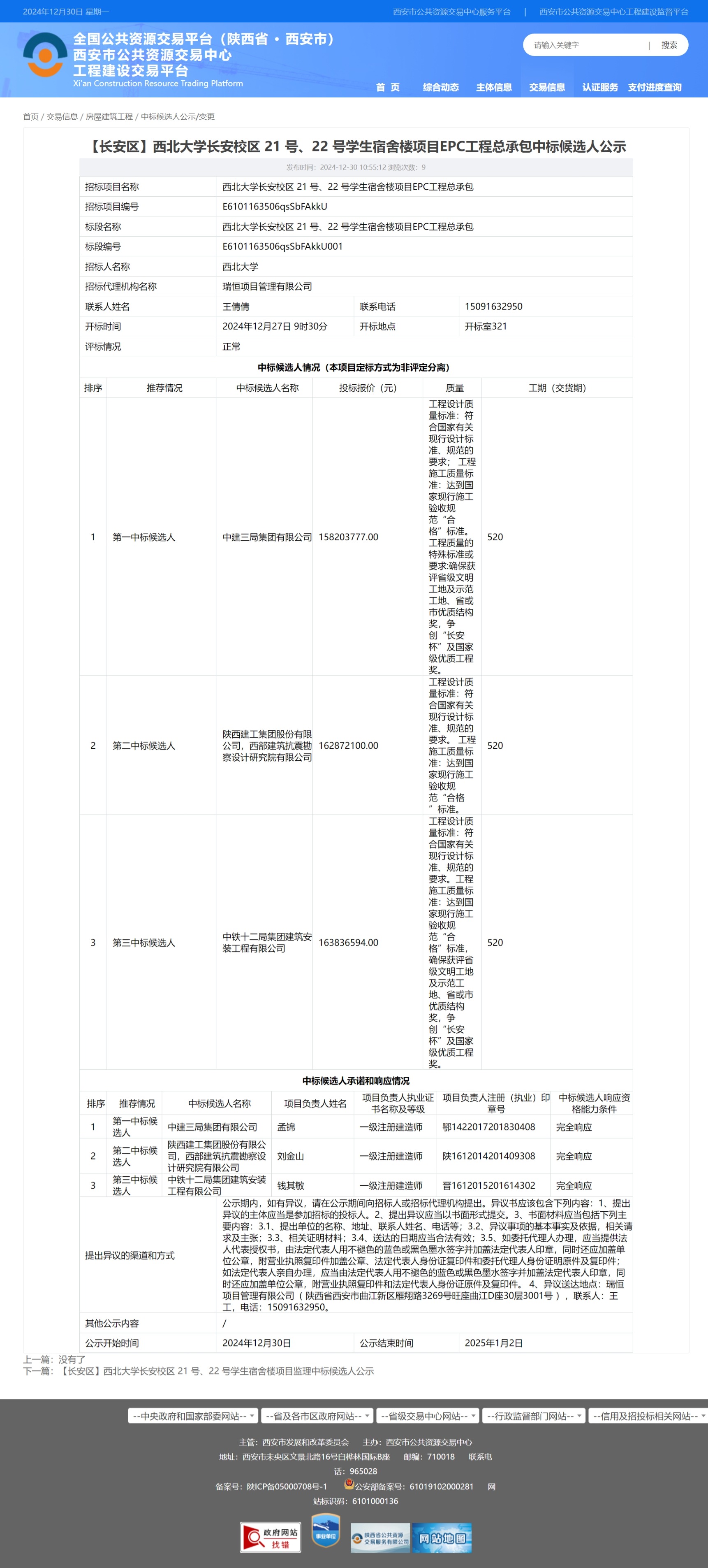 西北大学长安校区 21 号、22 号学生宿舍楼项目EPC工程总承包中标候选人公示