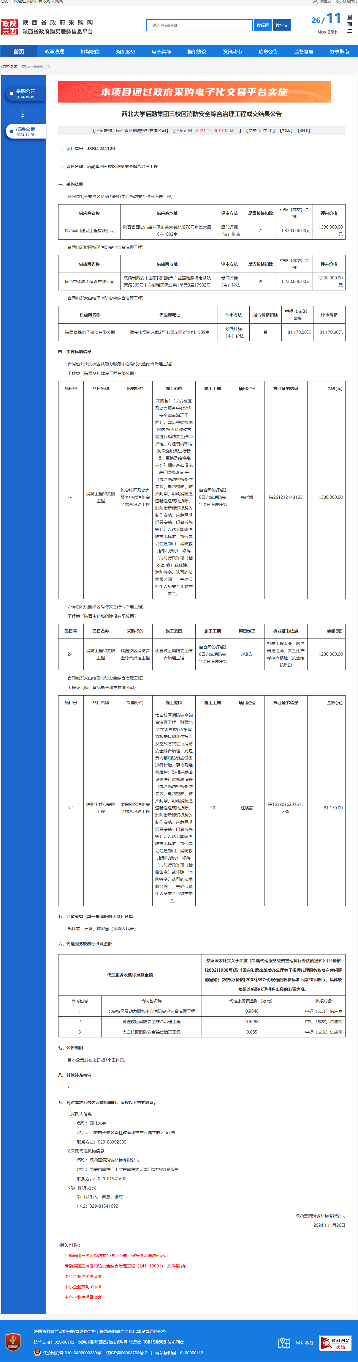 西北大学后勤集团三校区消防安全综合治理工程成交结果公告