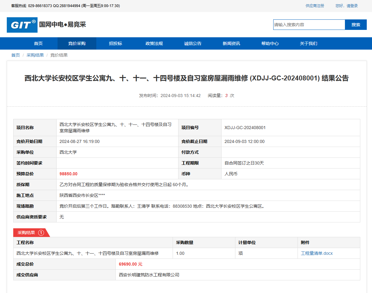 西北大学长安校区学生公寓九、十、十一、十四号楼及自习室房屋漏雨维修 (XDJJ-GC-202408001) 竞价结果公告