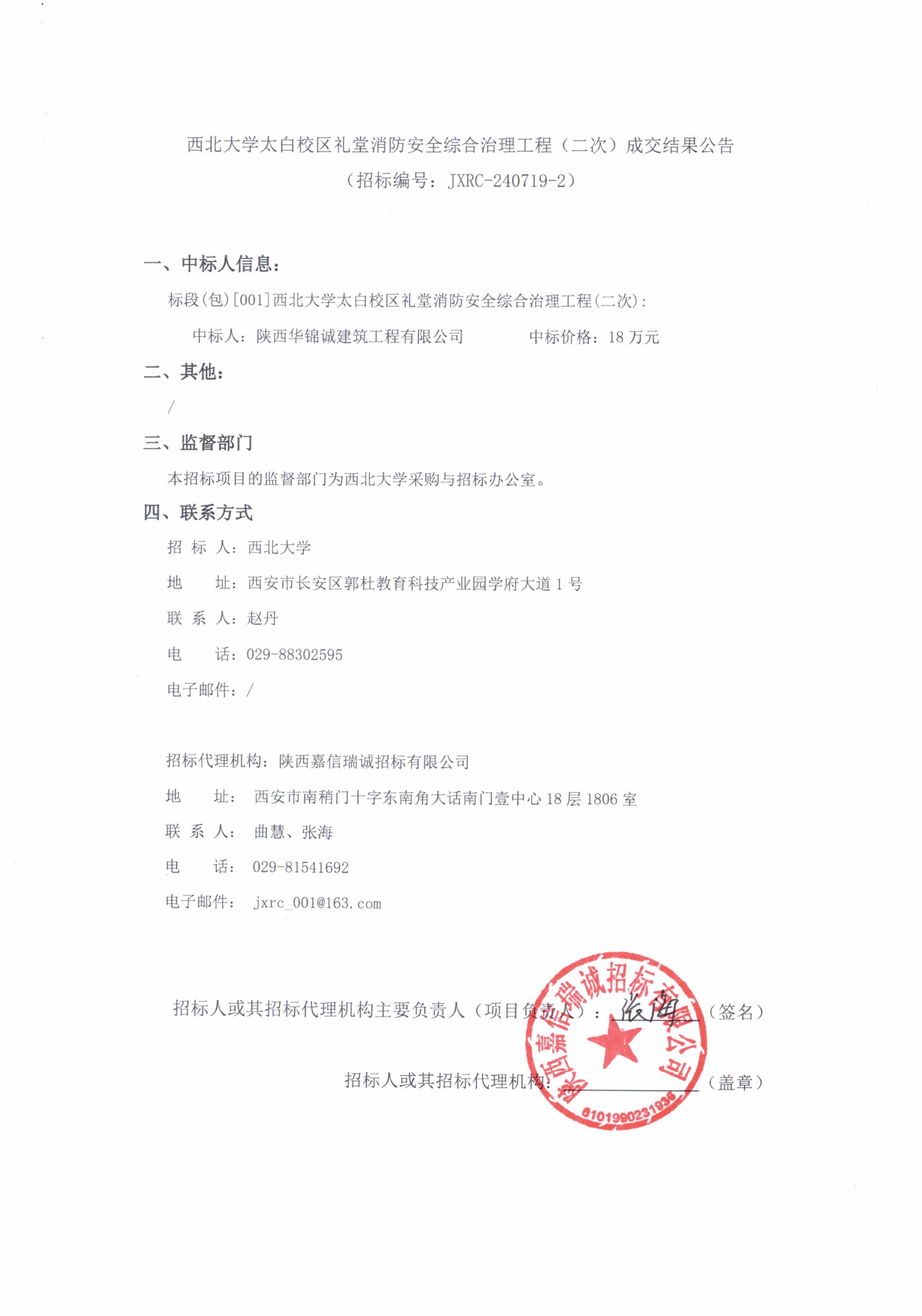 西北大学太白校区礼堂消防安全综合治理工程(二次)成交结果公告