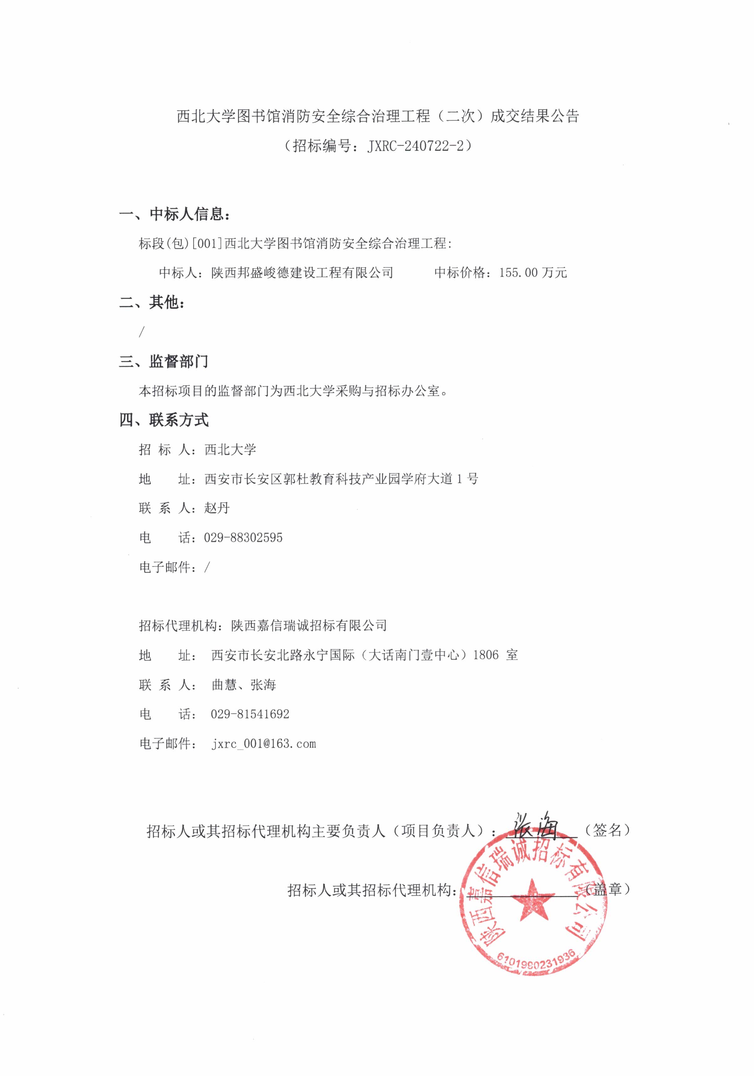 西北大学图书馆消防安全综合治理工程(二次)成交结果公告