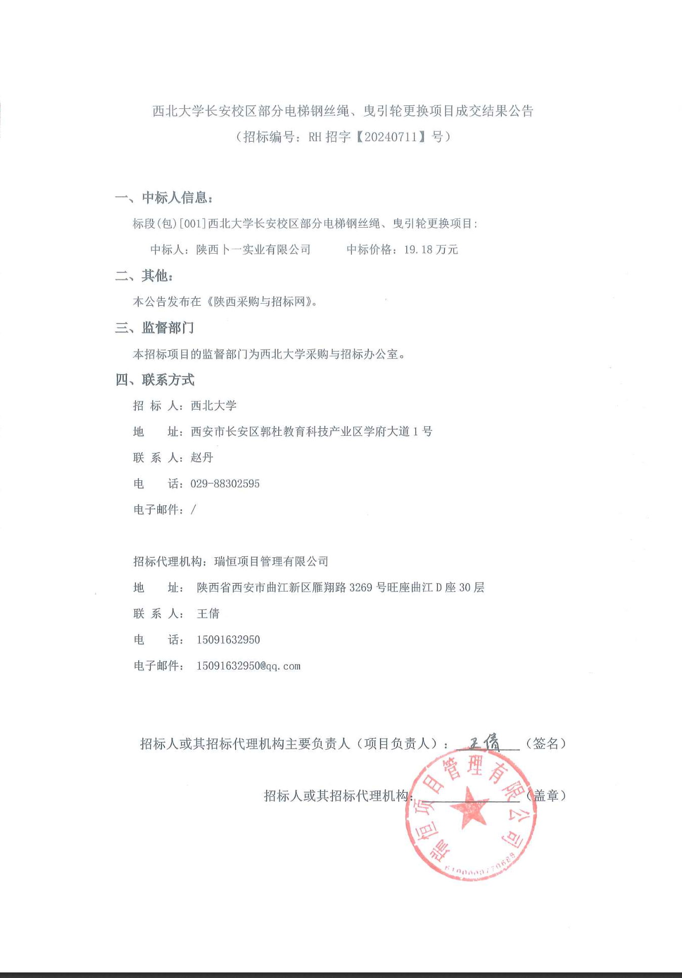 西北大学长安校区部分电梯钢丝绳、曳引轮更换项目成交结果公告