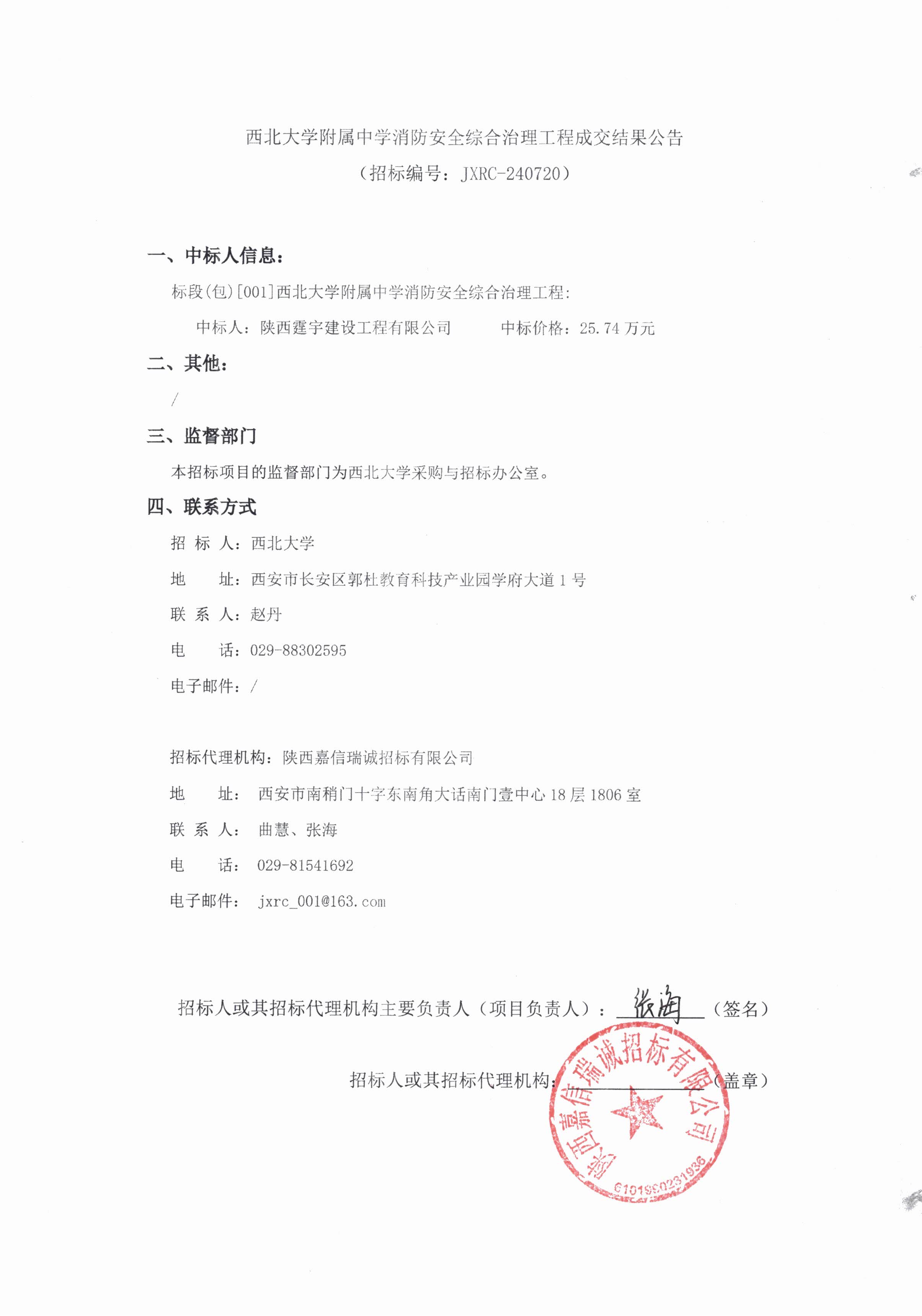 西北大学附属中学消防安全综合治理工程成交结果公告