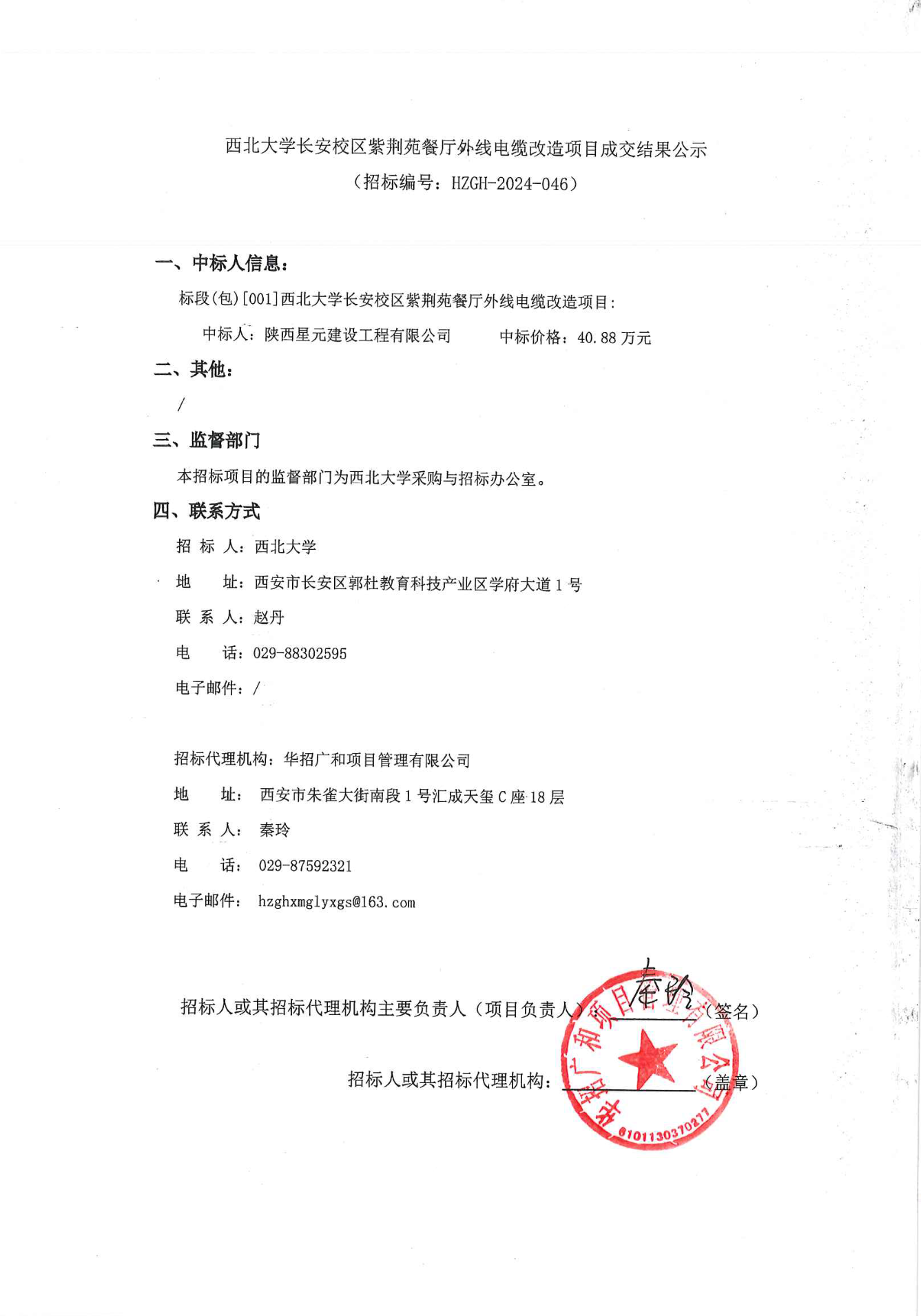 西北大学长安校区紫荆苑餐厅外线电缆改造项目成交结果公示