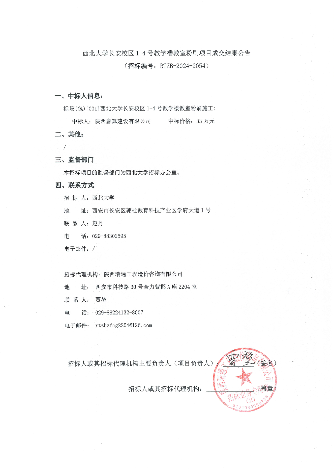 西北大学长安校区1-4号教学楼教室粉刷项目成交结果公告