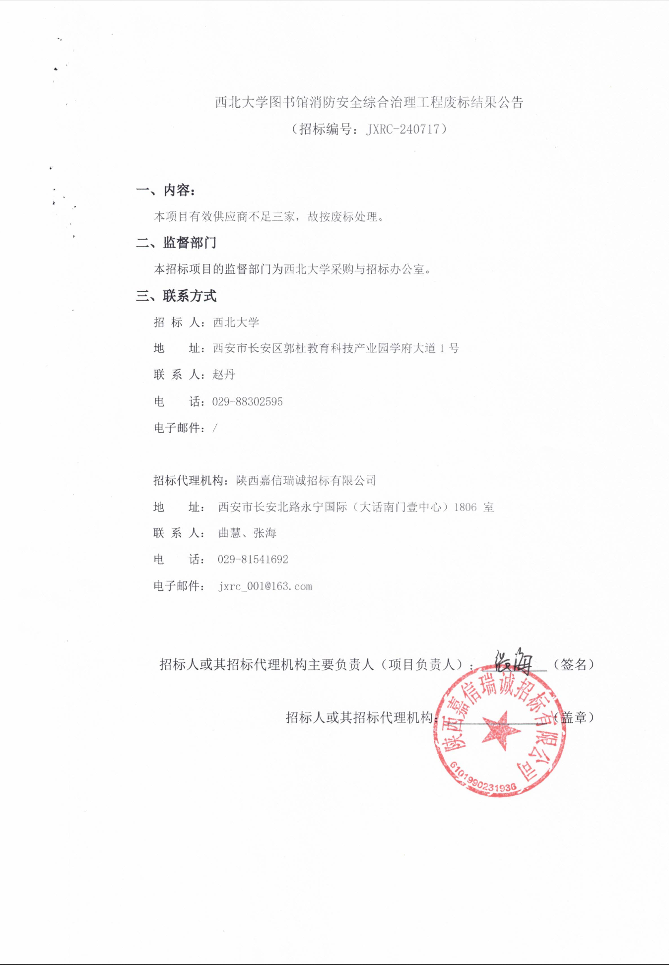 西北大学图书馆消防安全综合治理工程废标结果公告