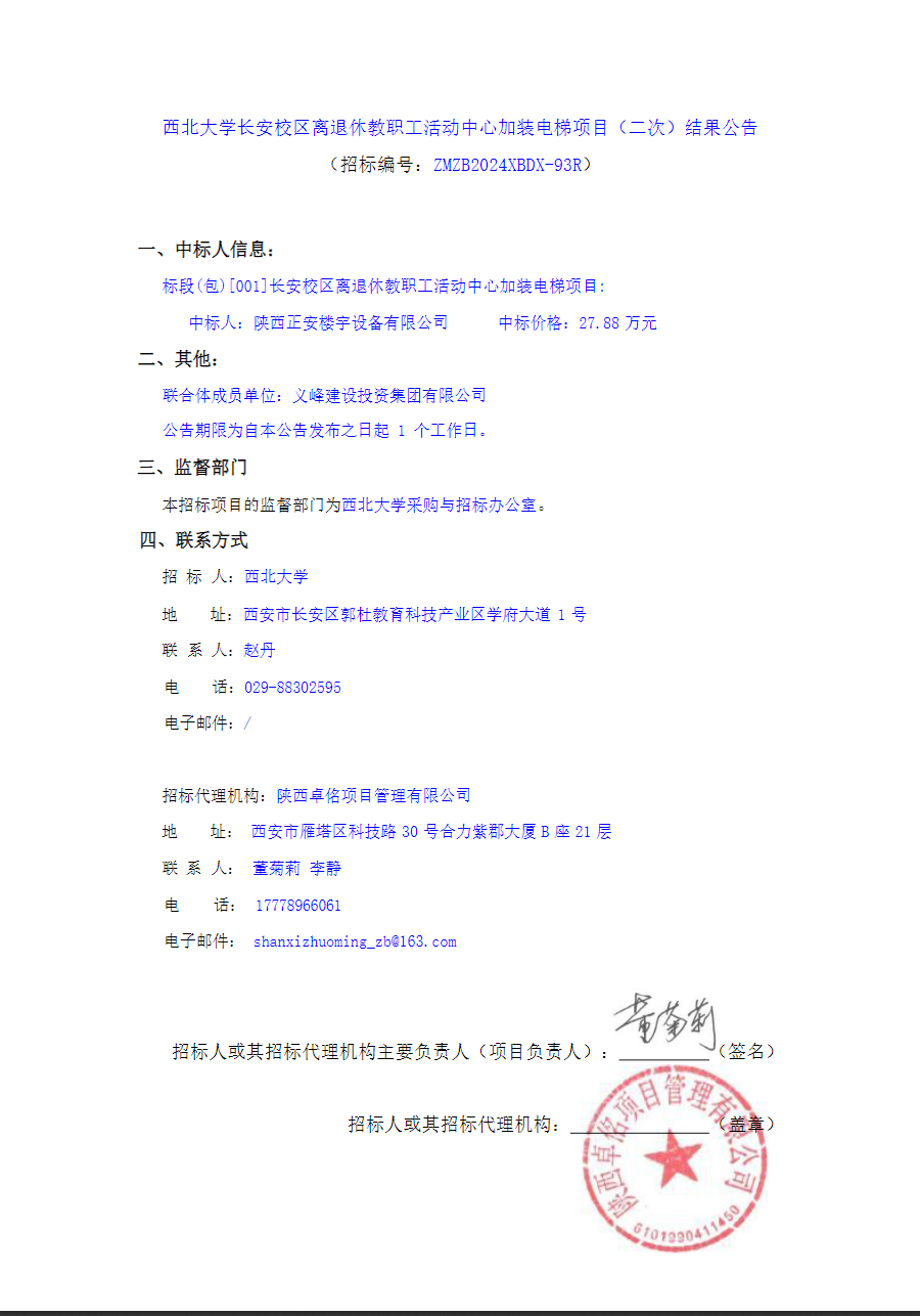 西北大学长安校区离退休教职工活动中心加装电梯项目(二次)结果公告