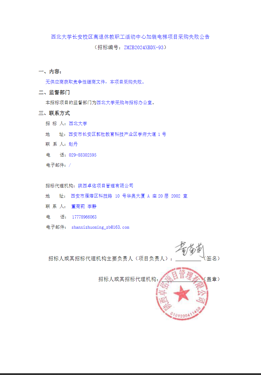 西北大学长安校区离退休教职工活动中心加装电梯项目采购失败公告