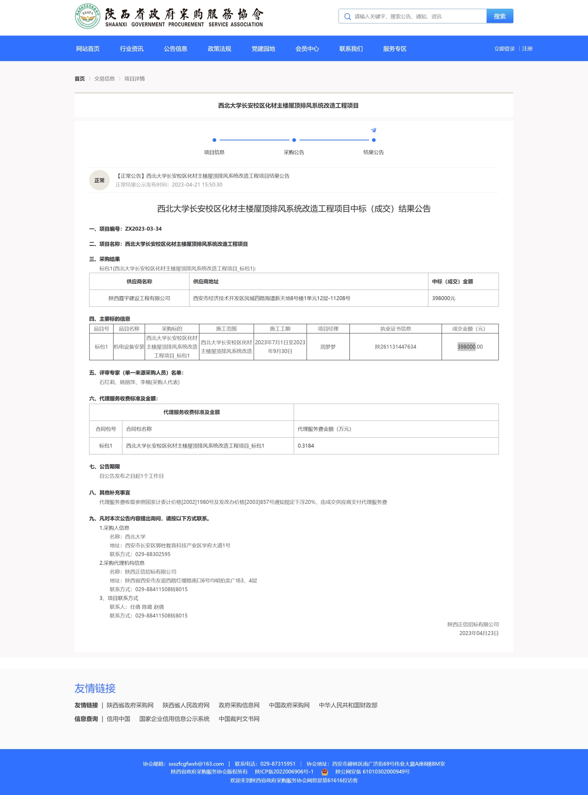 西北大学长安校区化材主楼屋顶排风系统改造工程项目中标(成交)结果公告