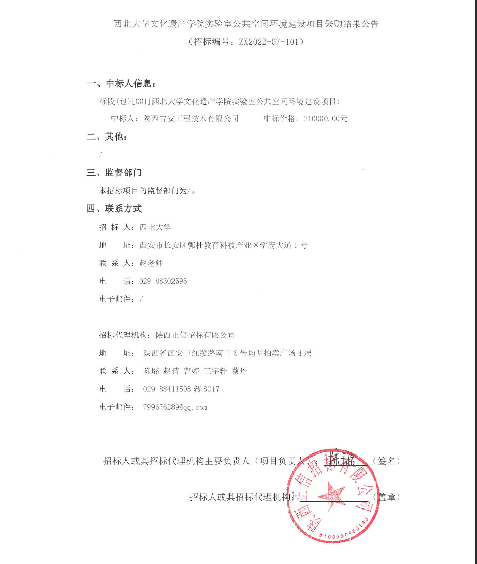 西北大学文化遗产学院实验室公共空间环境建设项目采购结果公告
