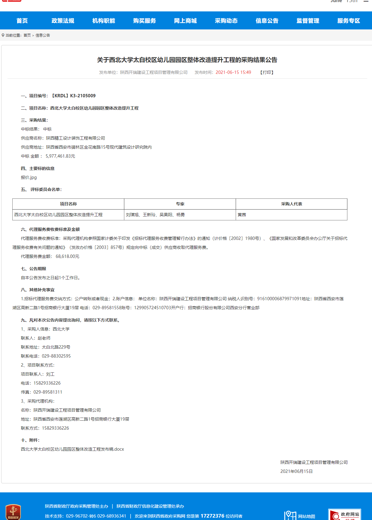西北大学太白校区幼儿园园区整体改造提升工程的采购结果公告