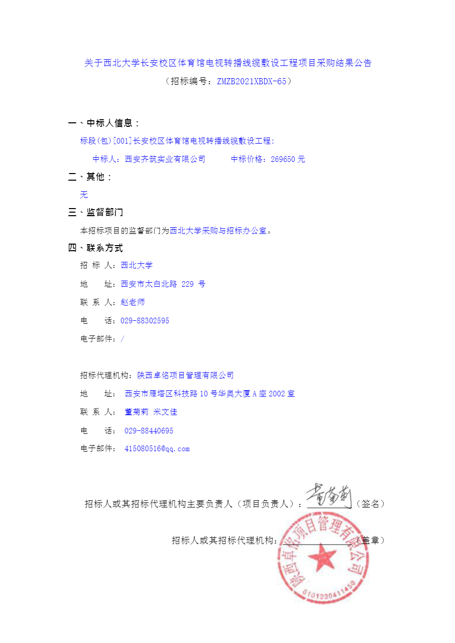 关于西北大学长安校区体育馆电视转播线缆敷设工程项目采购结果公告
