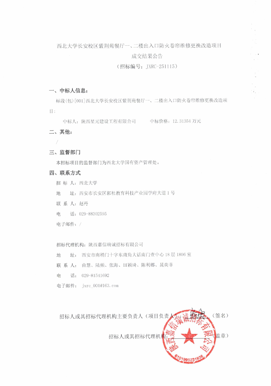 西北大学长安校区紫荆苑餐厅一、二楼出入口防火卷帘维修更换改造项目成交结果公告
