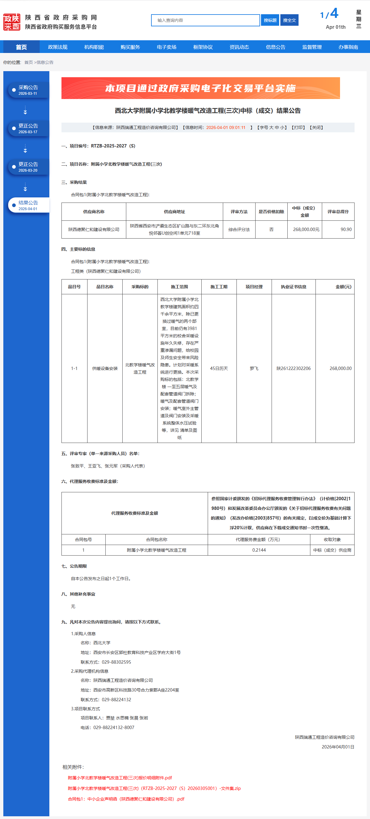 西北大学附属小学北教学楼暖气改造工程(三次)中标(成交)结果公告